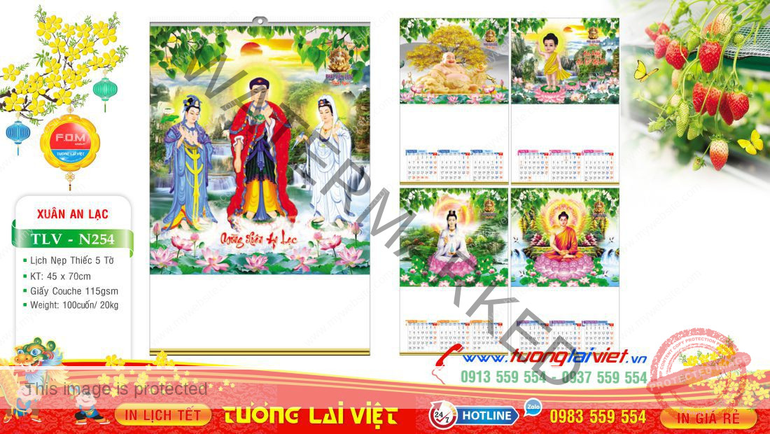 Lịch 5 tờ nẹp thiếc thường được in Offset 1 mặt trên giấy C105gsm, có kích thước: 36×70 và 45x70cm. Lịch 5 tờ Lịch phật giáo là mẫu lịch tờ treo tường giá rẻ nên được nhiều cửa hàng nhỏ lẻ chọn in lịch tết năm nay để làm quà tặng cuối năm cho khách hàng, bạn bè, đối tác và người thân nhân dịp năm mới.
