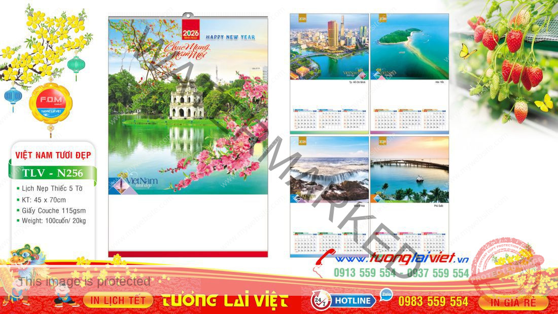 Lịch 5 tờ nẹp thiếc thường được in Offset 1 mặt trên giấy C105gsm, có kích thước: 36×70 và 45x70cm. Lịch 5 tờ Thắng cảnh là mẫu lịch tờ treo tường giá rẻ nên được nhiều cửa hàng nhỏ lẻ chọn in lịch tết năm nay để làm quà tặng cuối năm cho khách hàng, bạn bè, đối tác và người thân nhân dịp năm mới.