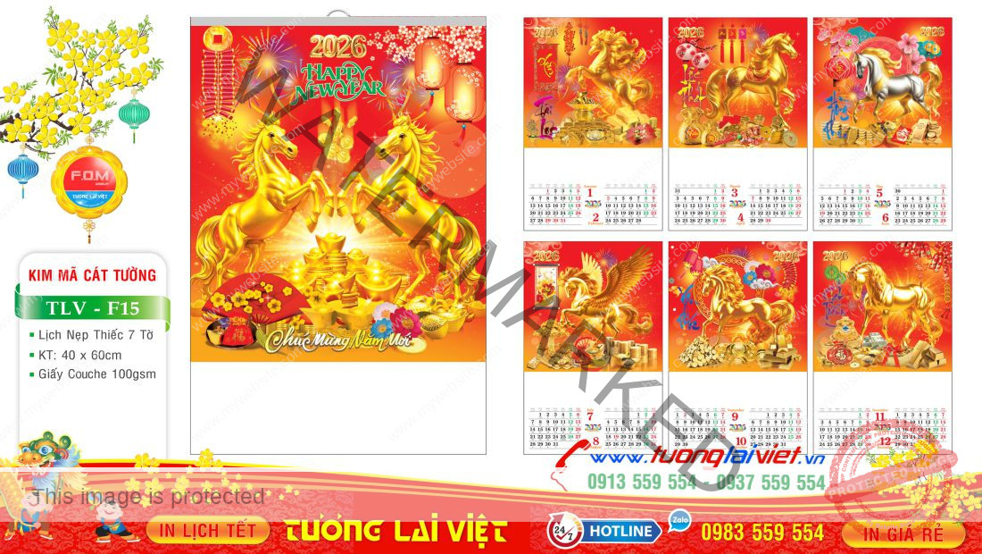 Lịch 7 tờ nẹp thiếc thường được in Offset 1 mặt trên giấy C105gsm, có kích thước: 36×70 và 45x70cm. Lịch 7 tờ Mã Đáo Thành Công là mẫu lịch tờ treo tường giá rẻ nên được nhiều cửa hàng nhỏ lẻ chọn in lịch tết năm nay để làm quà tặng cuối năm cho khách hàng, bạn bè, đối tác và người thân nhân dịp năm mới.